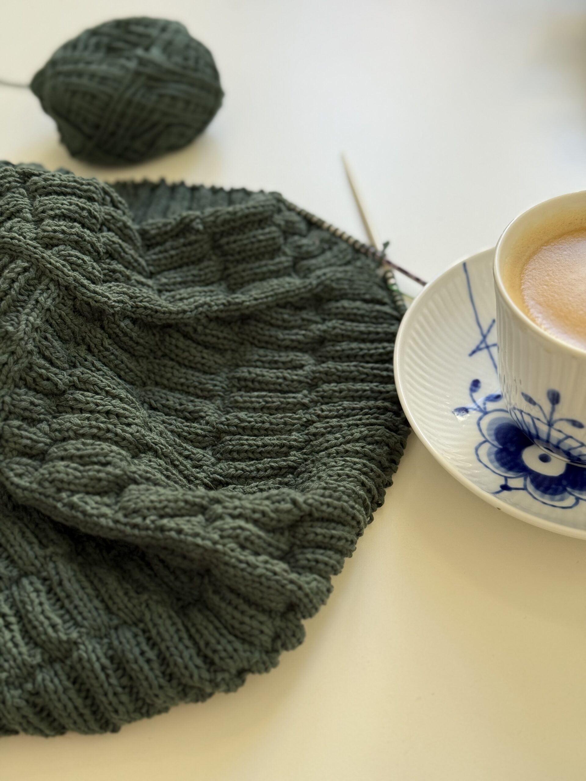 *når du laver en strikkeprøve, så skal du strikke mindst 24 pinde i mønster, da mønster først rigtigt trækker sig sammen når der er strikket forskydningsrib.