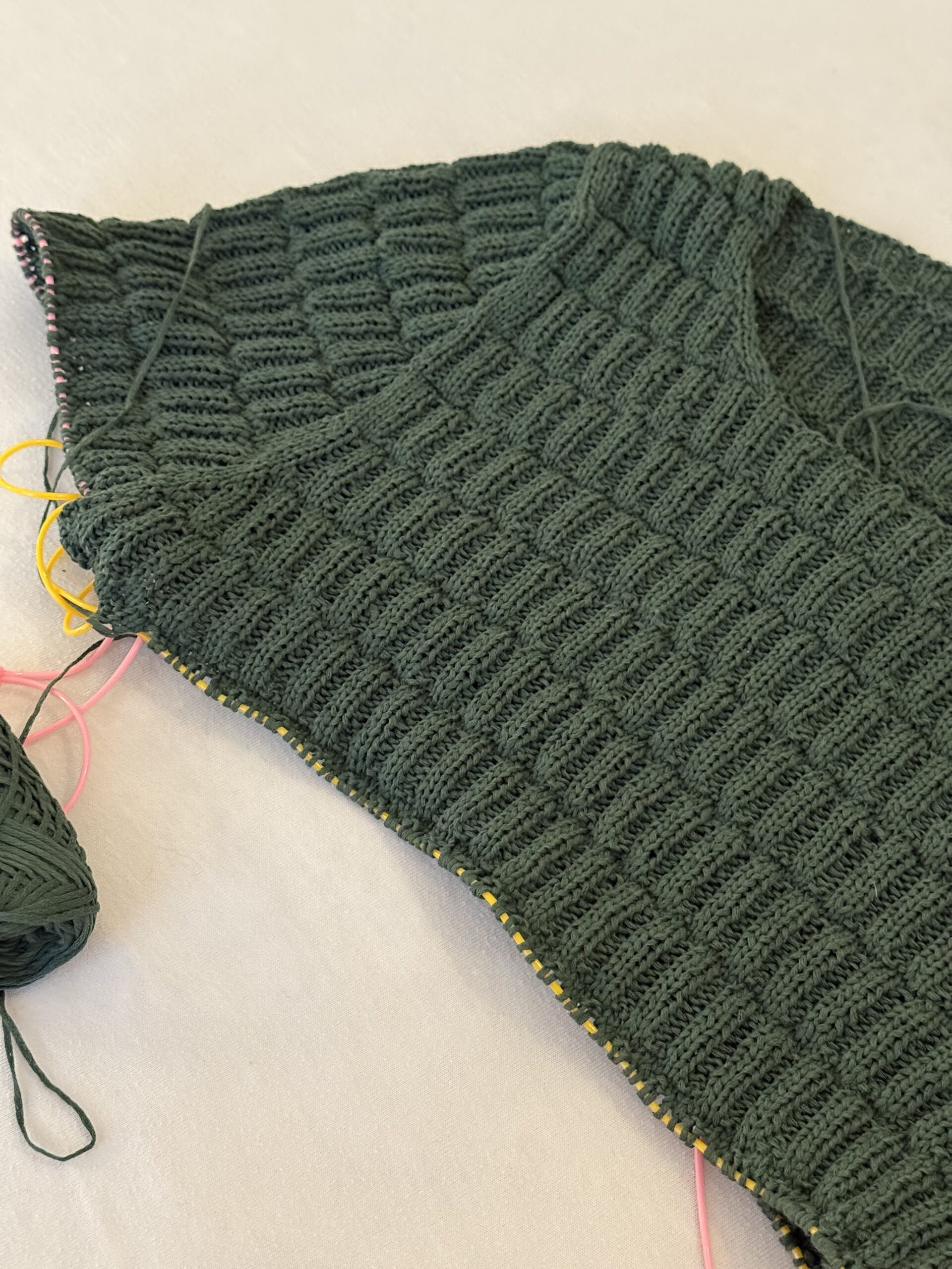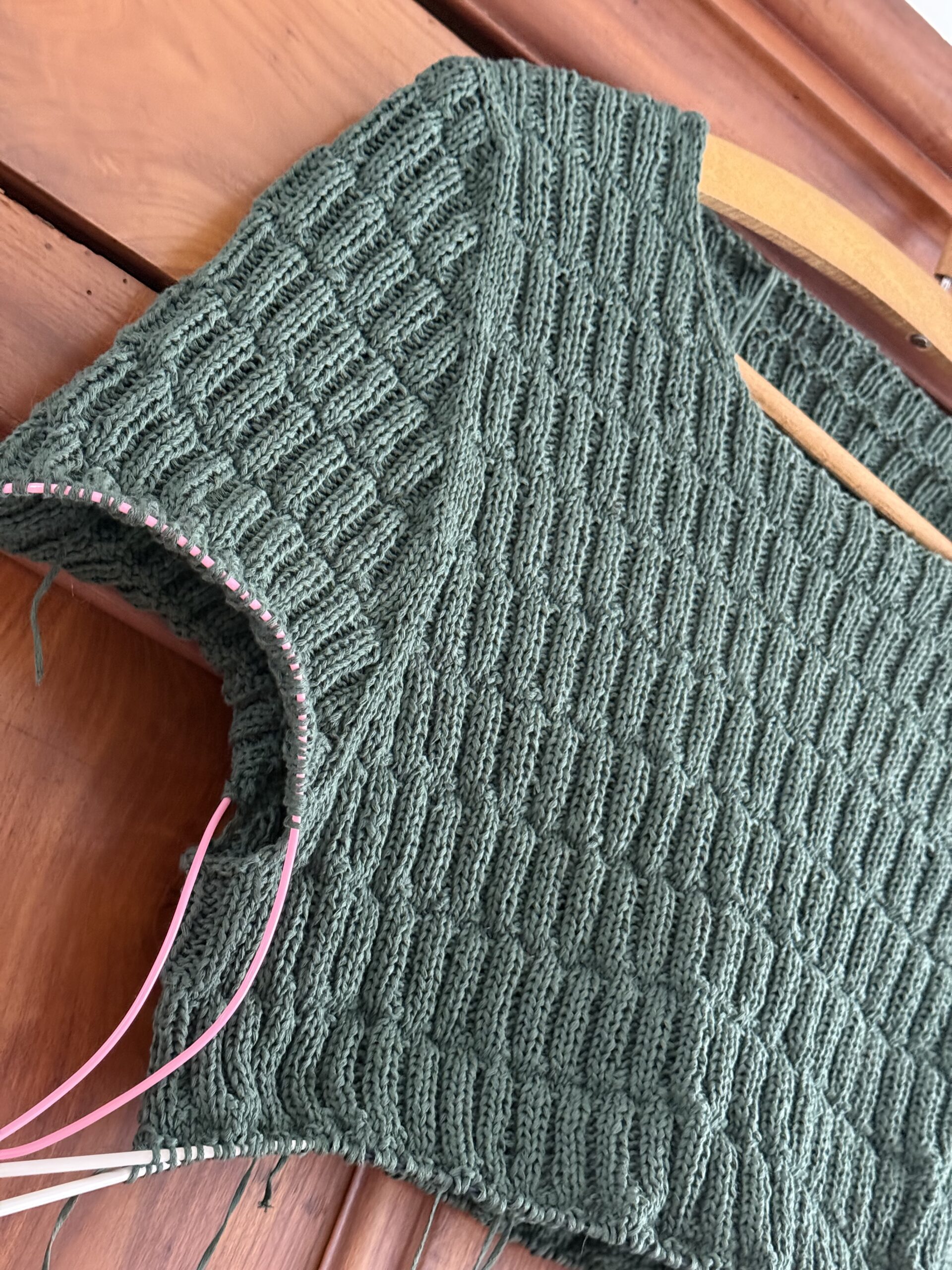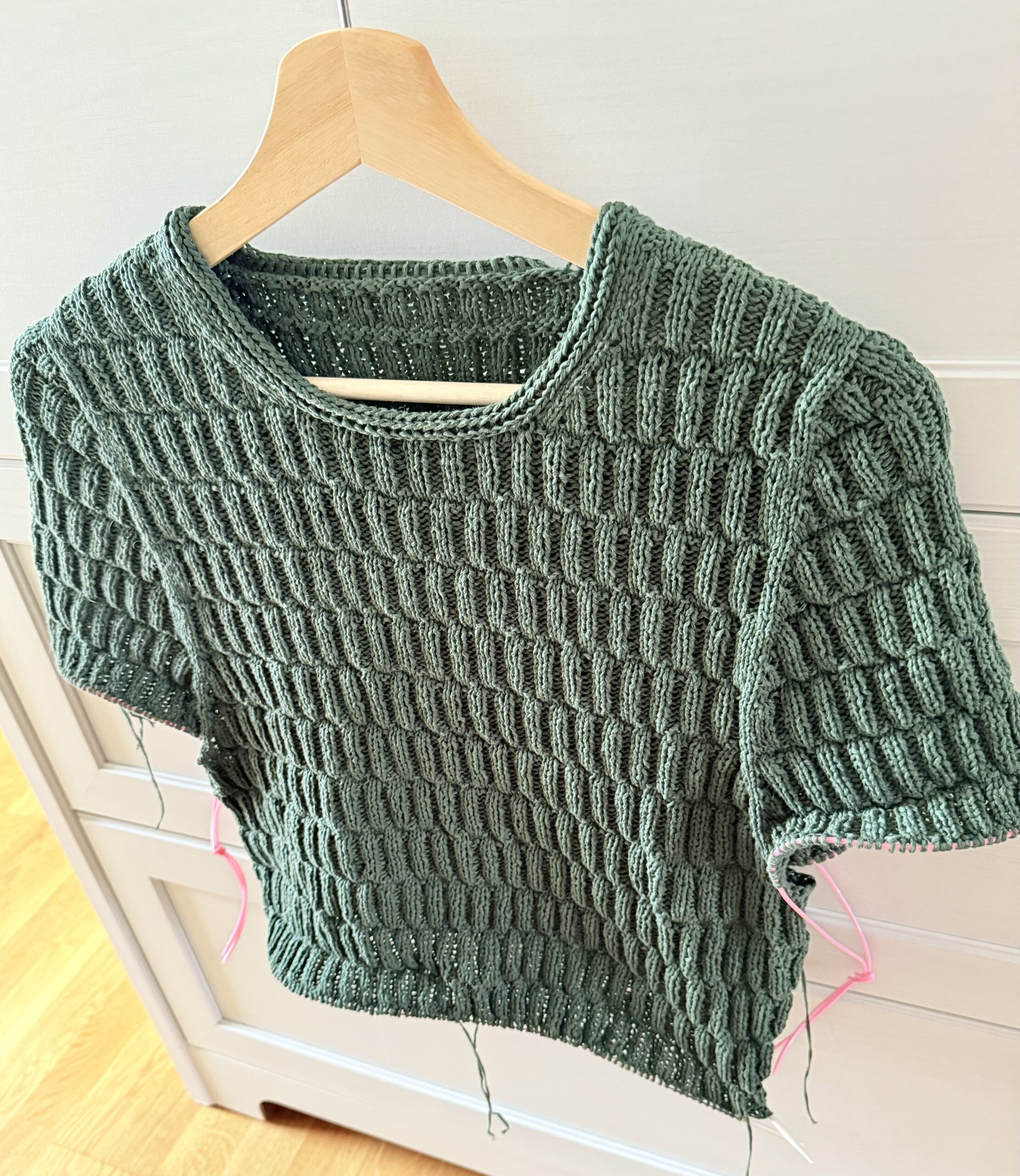 Jeg anbefaler Prym’s ergonomiske rundpinde. Ærmer strikkes rundt med magic-loop metoden