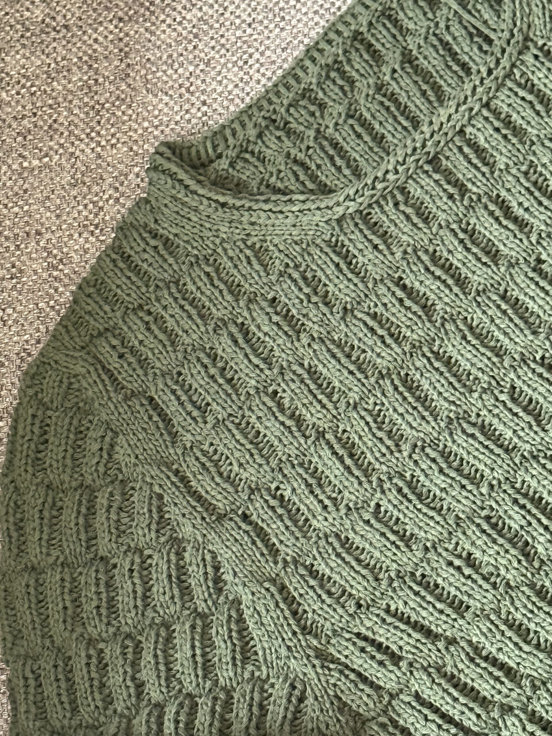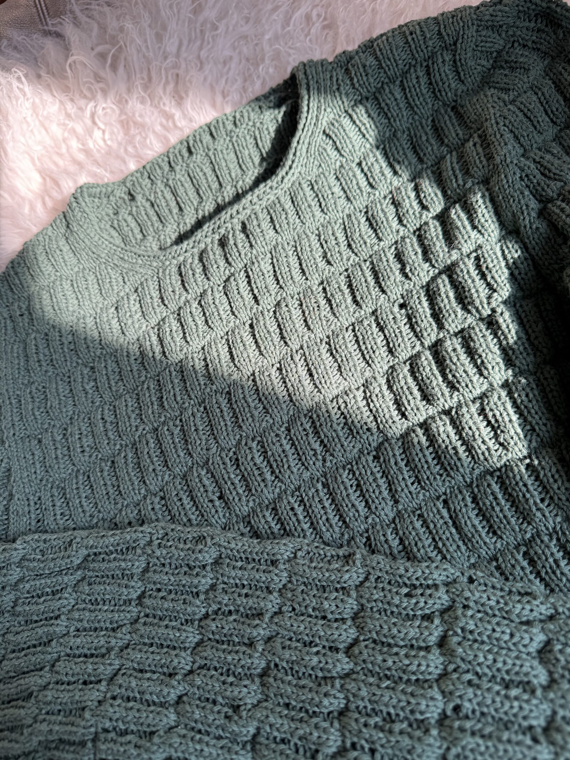 Sweateren er strikket oppefra og ned på rundpind 3,5 mm (vejledende).