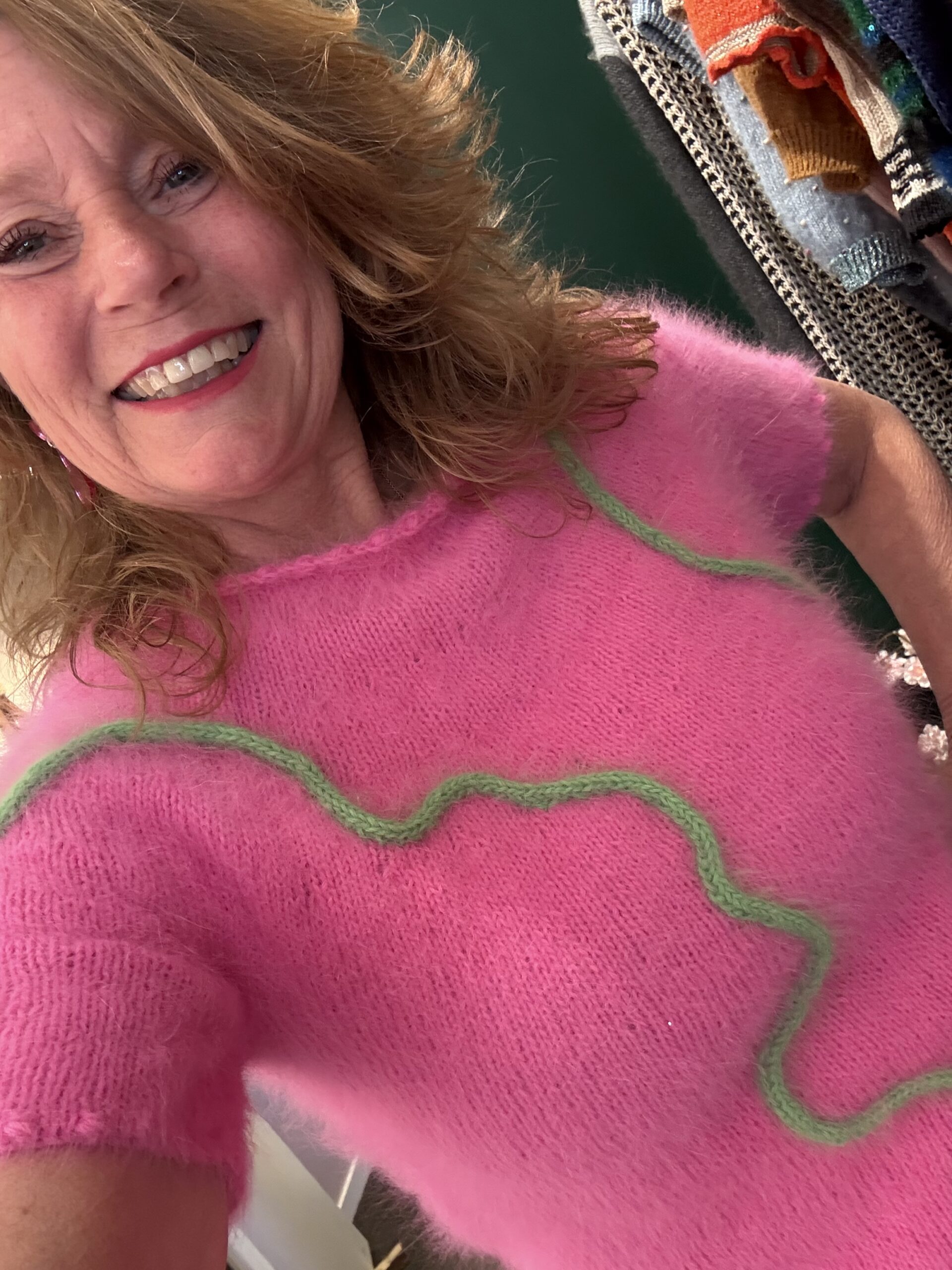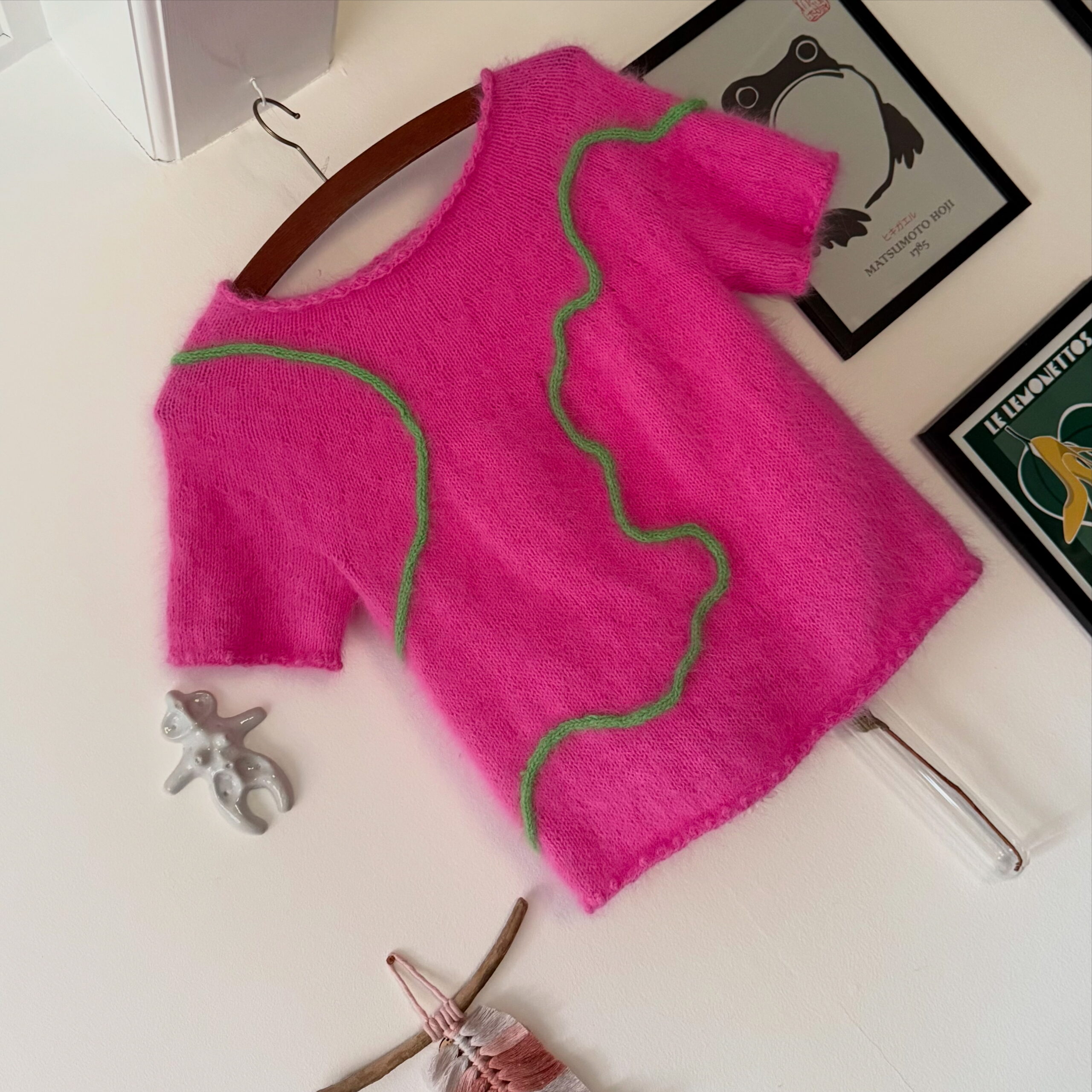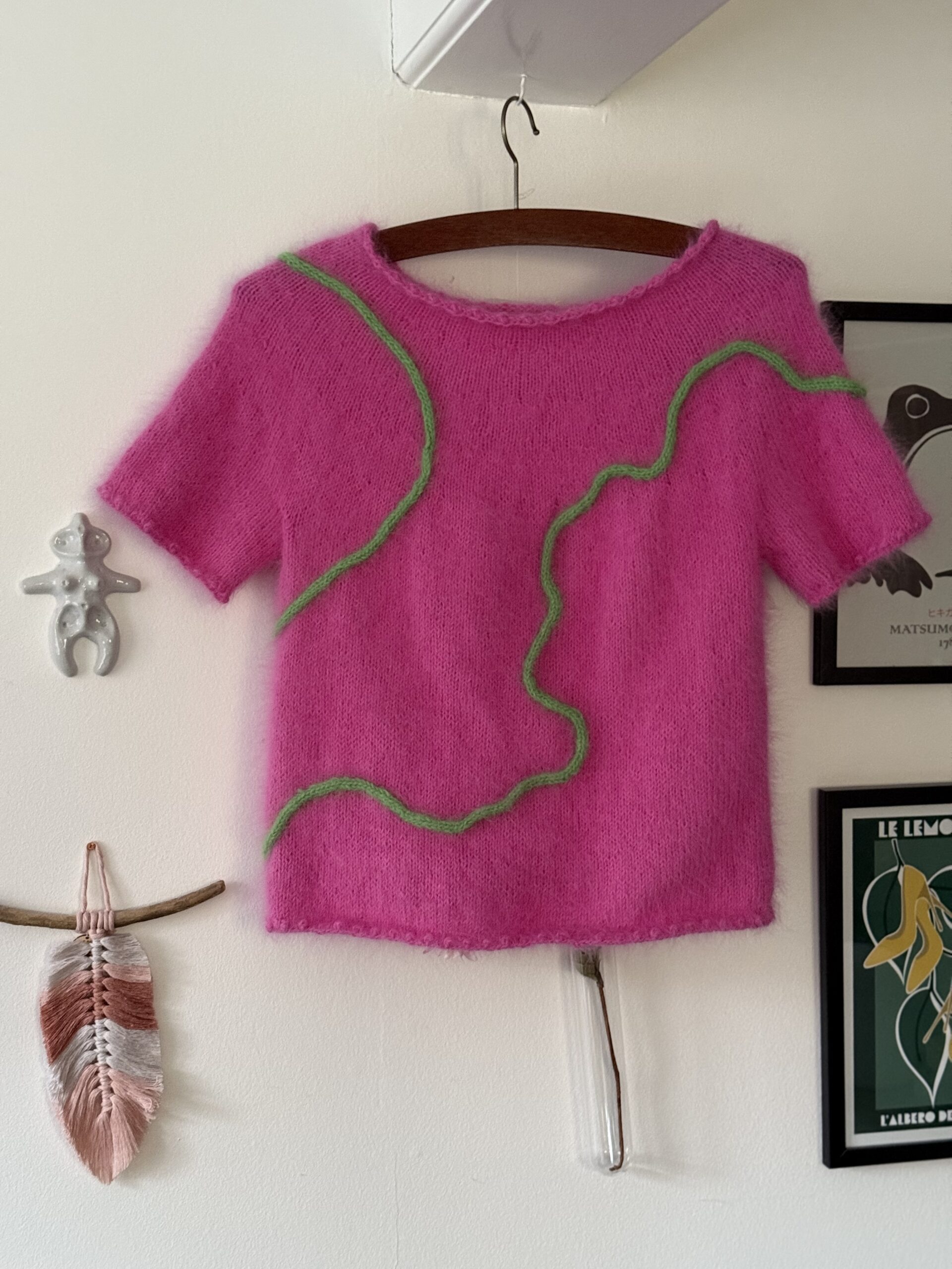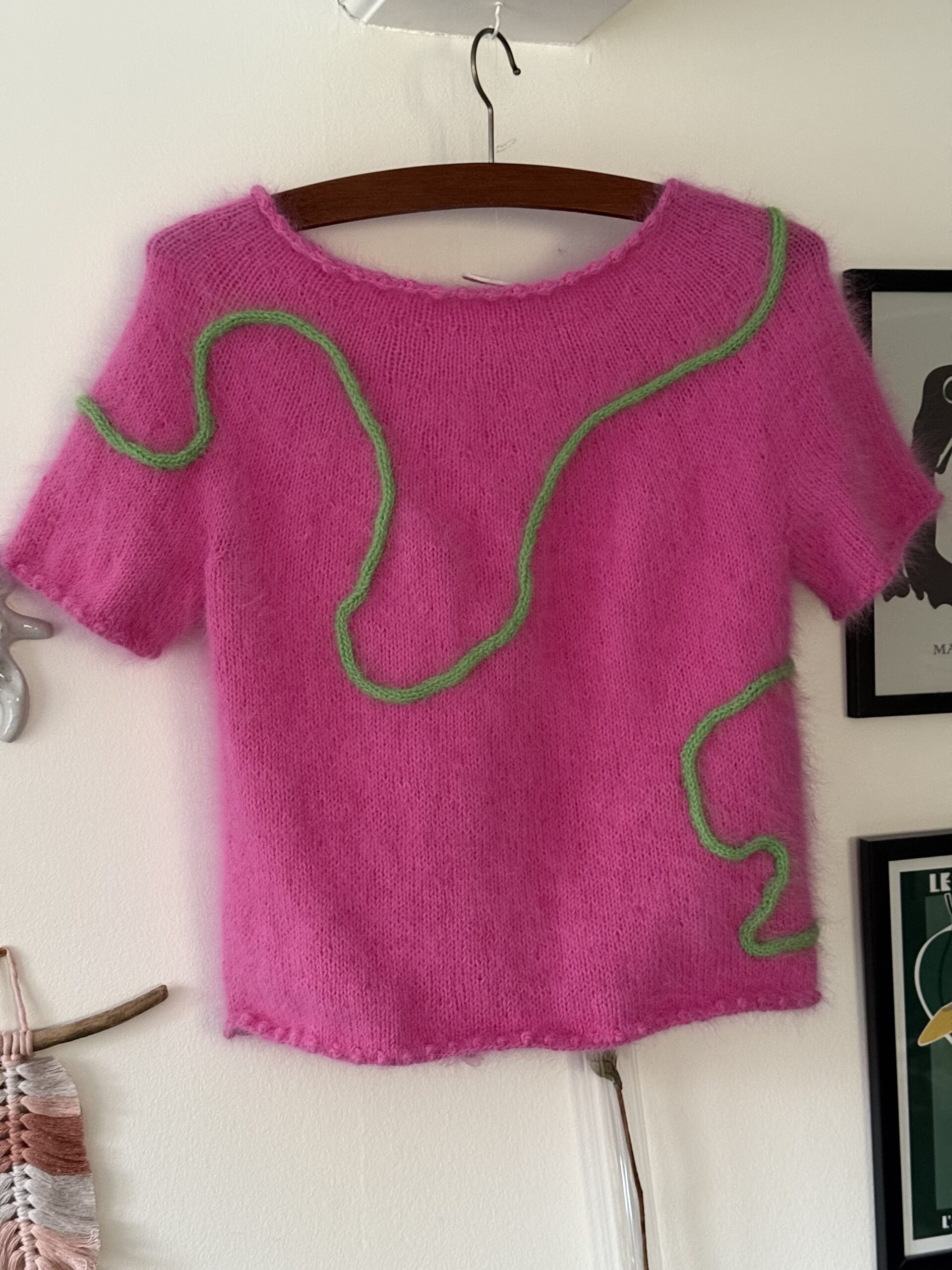 Strikkes nedefra og op. Boblekanter og glatstrik på rundpind 4 mm med en tråd Angora fra Mondial. Ærmer tilsættes kroppen og bærestykket strikkes rundt med indtagninger jævnt fordelt – dog raglan-indtagninger de første 1-4 omgange. Bortset fra at hæfte ender, og sy 4-6 masker ved hvert ærmegab, er modellen monteringsfri. DOG er der montering bagefter, når du syr dit mønster på.